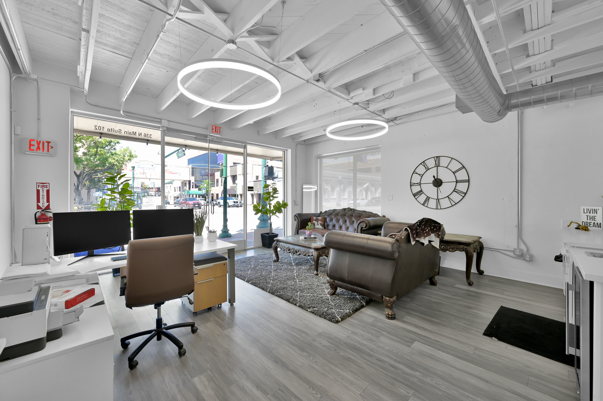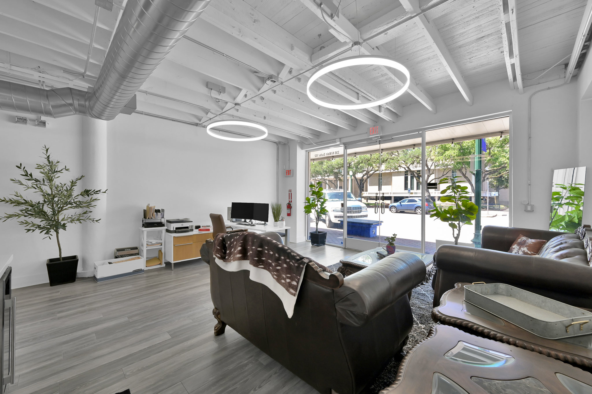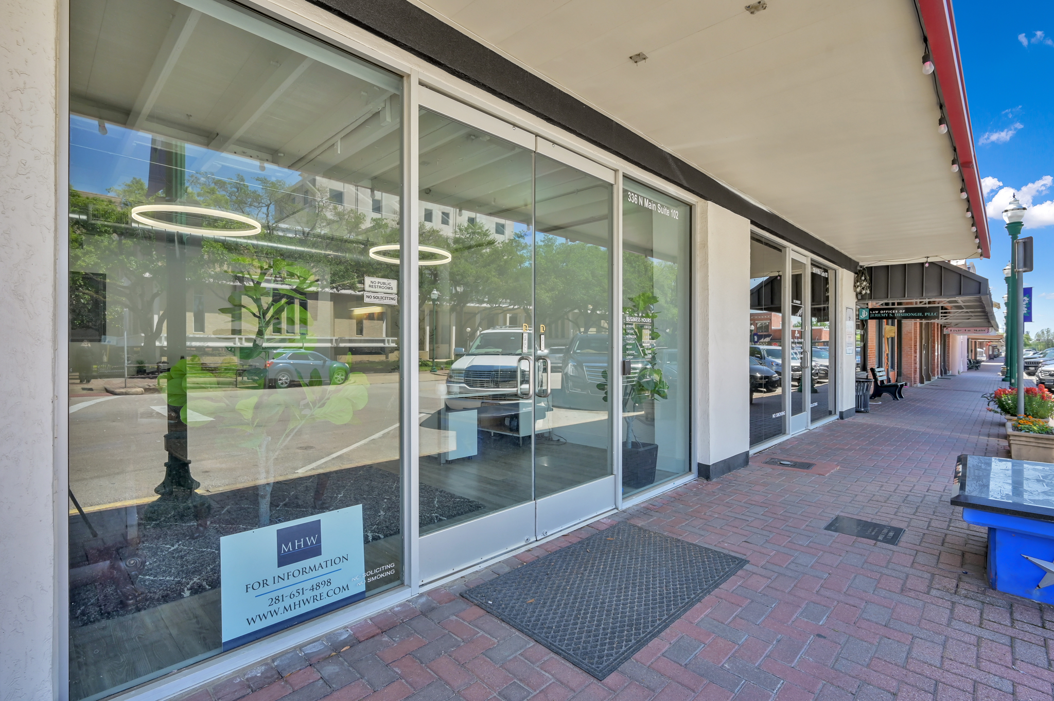 Presenting a modern, beautifully renovated commercial suite located at 336 N Main Street, Suite 102, in the bustling heart of downtown Conroe. This prime corner space offers exceptional visibility through expansive, floor-to-ceiling glass windows and doors, ensuring abundant natural light and prominent exposure.