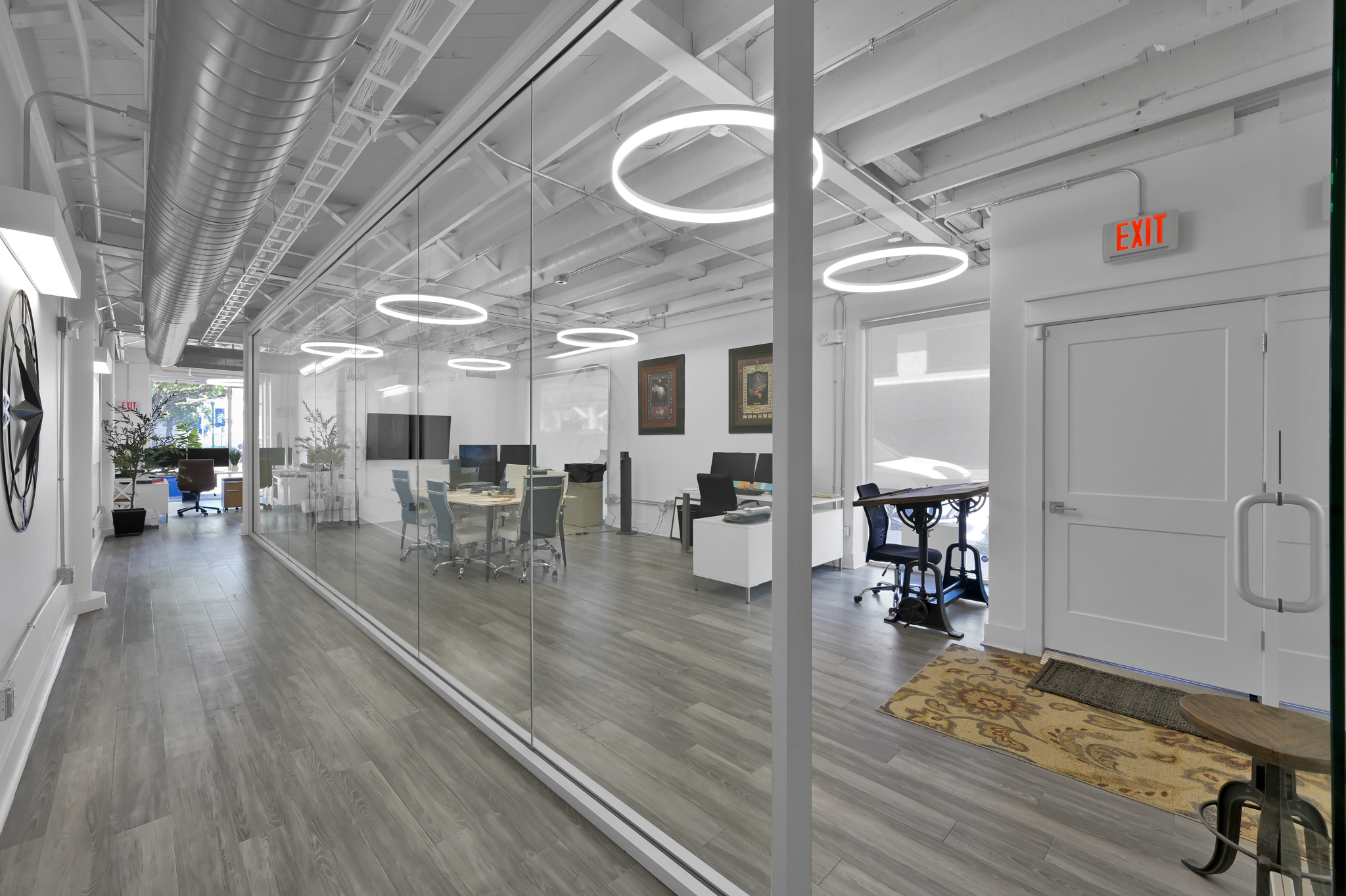 The suite features a large, sophisticated conference room enclosed by a striking glass wall, perfect for meetings, presentations, or collaborative work sessions. Modern lighting fixtures and ductwork contribute to the chic industrial ambiance, complementing the suite's contemporary styling.