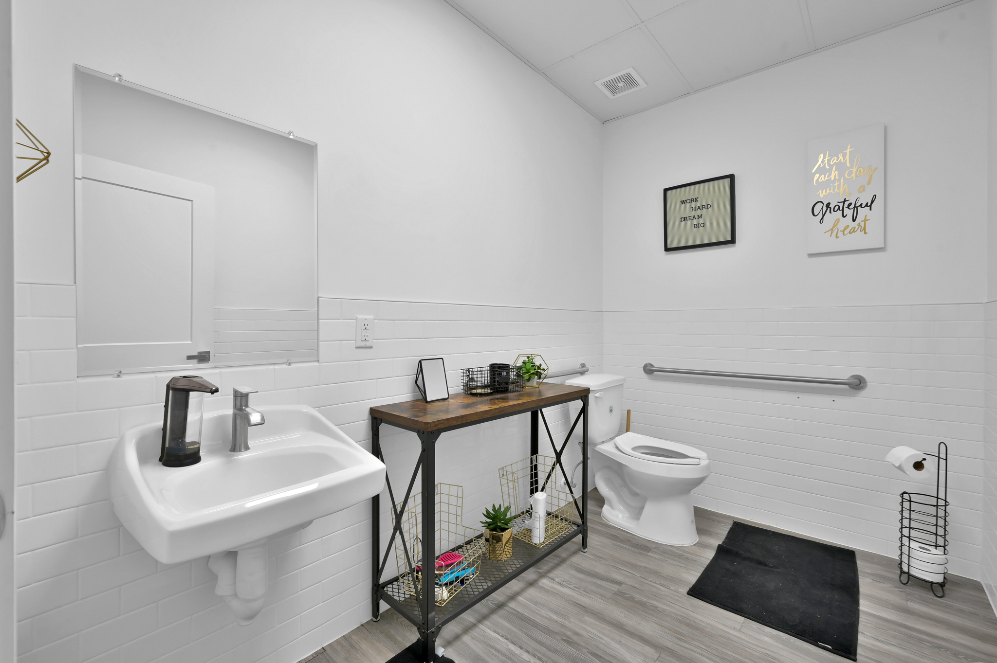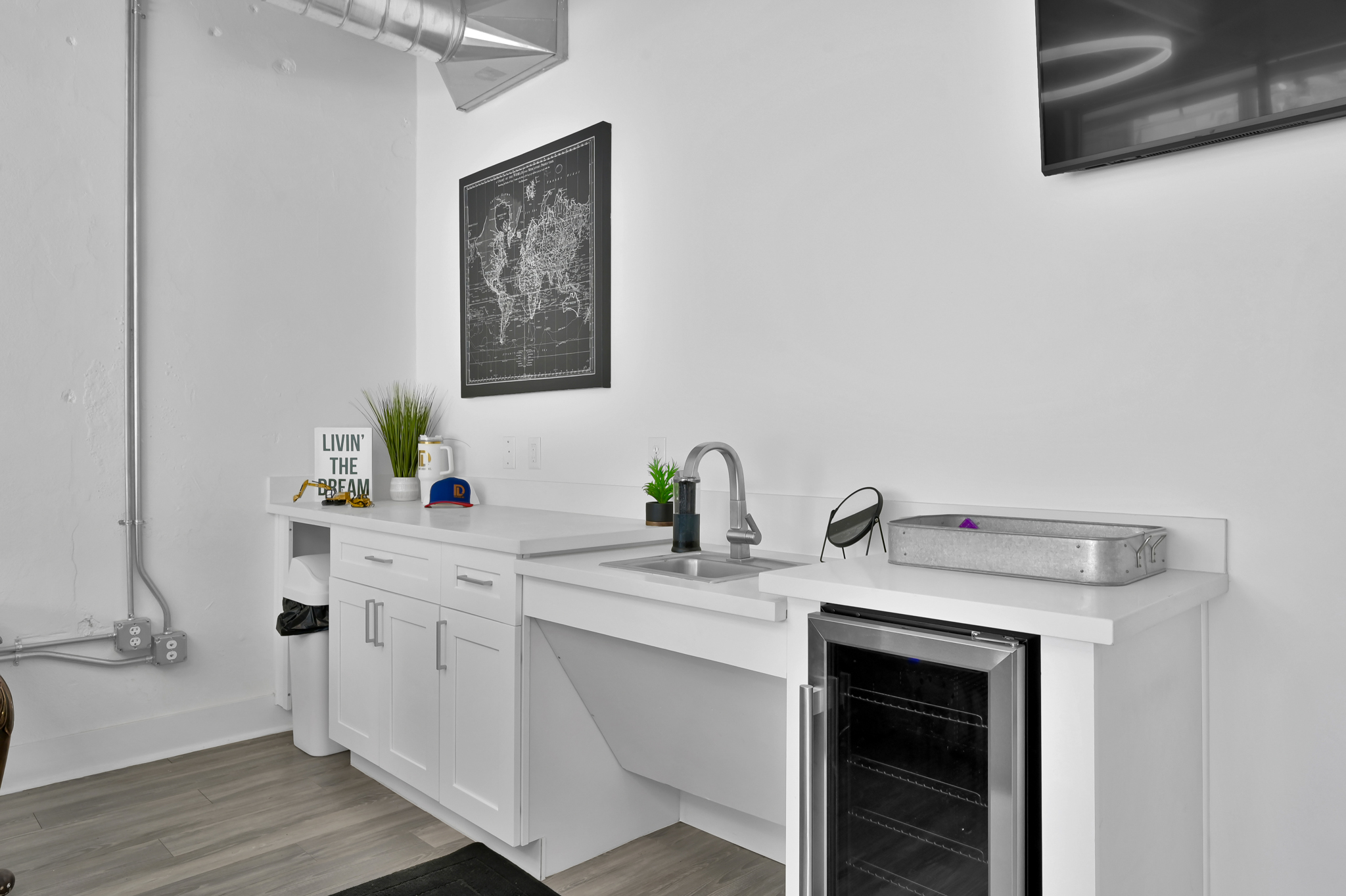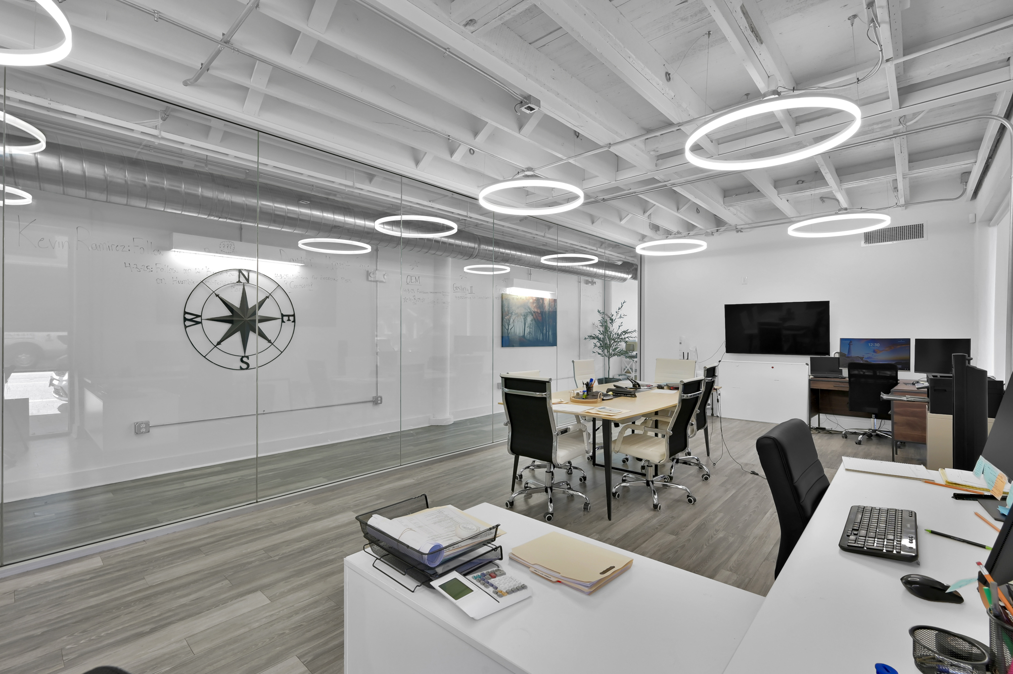 Spanning approximately 2,016 square feet, the suite has been thoughtfully designed with contemporary touches and high-quality finishes throughout. The open-concept layout includes bright, airy spaces, high ceilings with exposed beams, and stylish modern flooring, providing a clean and professional aesthetic. A well-appointed kitchenette featuring sleek cabinetry, modern fixtures, and a beverage fridge enhances functionality, making it ideal for hosting clients or comfortable employee breaks.